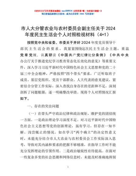 / 市人大分管农业与农村委员会副主任关于2024年度民主生活会个人对照检视材料(4+1)