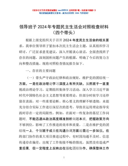 / 领导班子2024年专题民主生活会对照检查材料(四个带头)