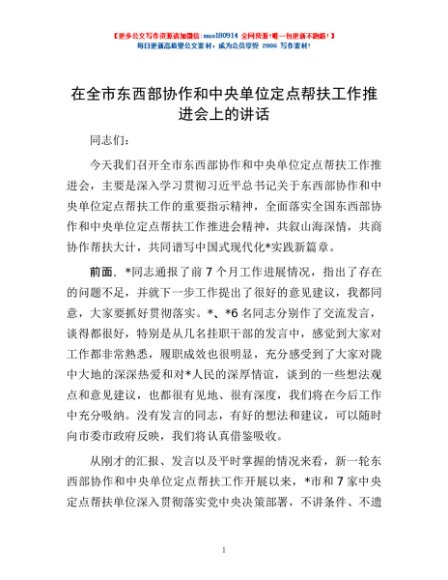 / 在全市东西部协作和中央单位定点帮扶工作推进会上的讲话