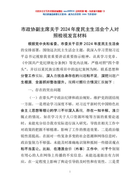 / 市政协副主席关于2024年度民主生活会个人对照检视发言材料