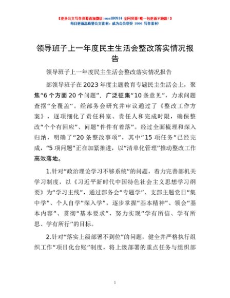/ 领导班子上一年度民主生活会整改落实情况报告