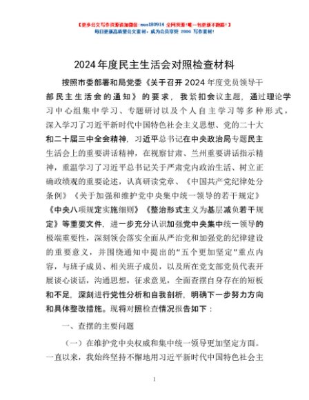 / 2024年度民主生活会对照检查材料