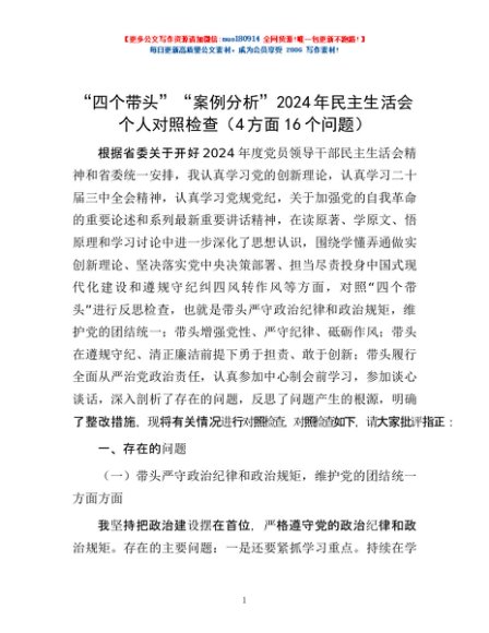 / “四个带头”“案例分析”2024年民主生活会个人对照检查(4方面16个问题)