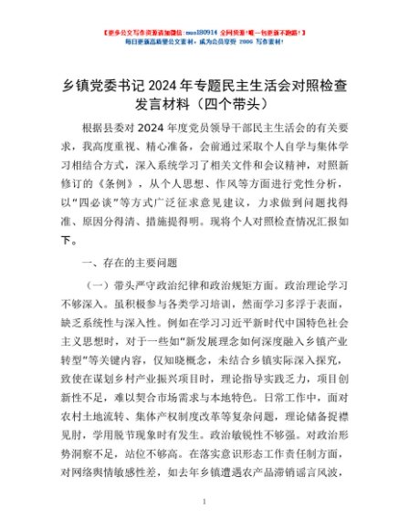 / 乡镇党委书记2024年专题民主生活会对照检查发言材料(四个带头)