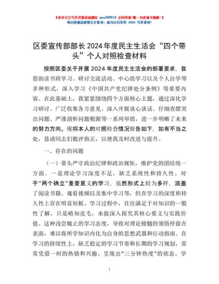 / 区委宣传部部长2024年度民主生活会“四个带头”个人对照检查材料