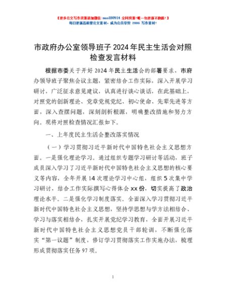 / 市政府办公室领导班子2024年民主生活会对照检查发言材料
