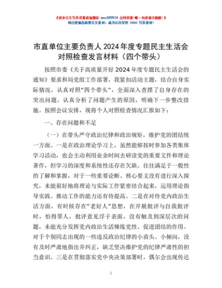 / 市直单位主要负责人2024年度专题民主生活会对照检查发言材料(四个带头)