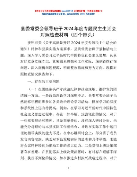 / 县委常委会领导班子2024年度专题民主生活会对照检查材料(四个带头)