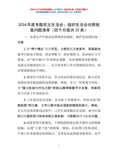 / 2024年度专题民主生活会、组织生活会对照检查问题清单(四个方面共32条)