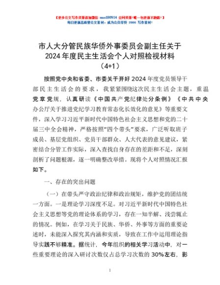 / 市人大分管民族华侨外事委员会副主任关于2024年度民主生活会个人对照检视材料(4+1)