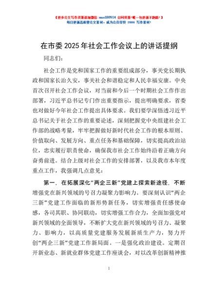 / 在市委2025年社会工作会议上的讲话提纲