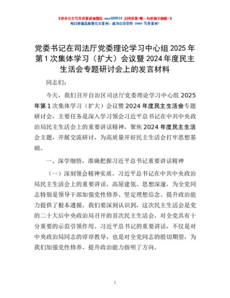 / 党委书记在司法厅党委理论学习中心组2025年第1次集体学习(扩大)会议暨2024年度民主生活会专题研讨会上的发言材料