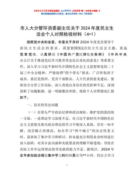 / 市人大分管环资委副主任关于2024年度民主生活会个人对照检视材料(4+1)