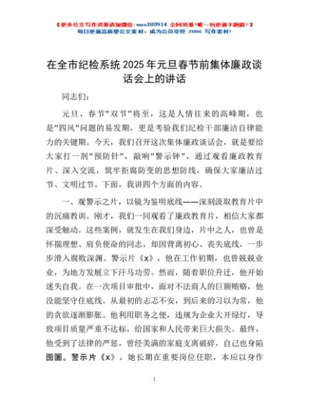 / 在全市纪检系统2025年元旦春节前集体廉政谈话会上的讲话