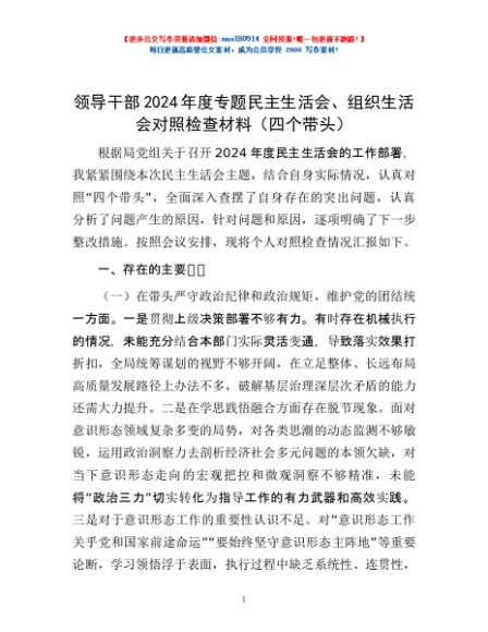 / 领导干部2024年度专题民主生活会、组织生活会对照检查材料(四个带头)