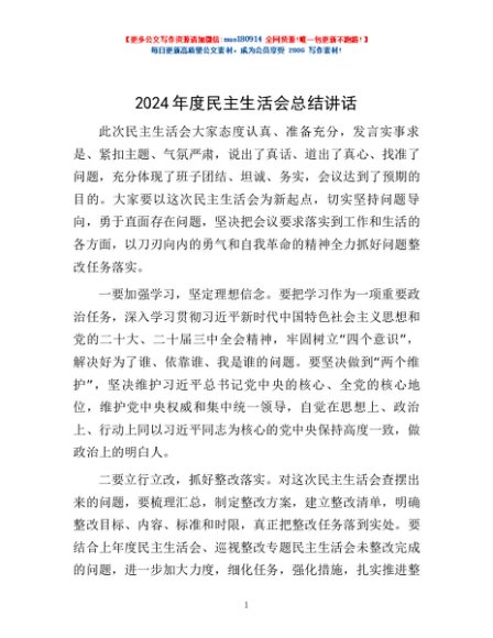 / 2024年度民主生活会总结讲话