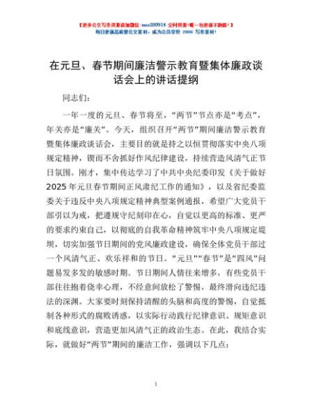 / 在元旦、春节期间廉洁警示教育暨集体廉政谈话会上的讲话提纲