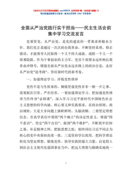 / 全面从严治党 践行实干担当——民主生活会前集中学习交流发言