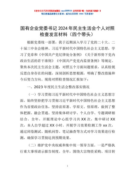 / 国有企业党委书记2024年民主生活会个人对照检查发言材料(四个带头)