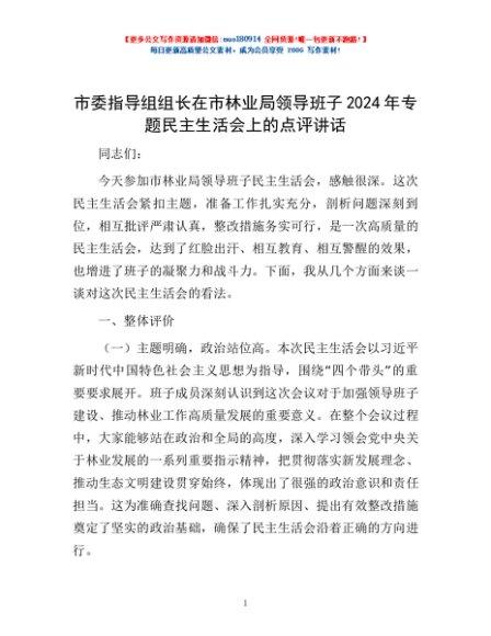 / 市委指导组组长在市林业局领导班子2024年专题民主生活会上的点评讲话