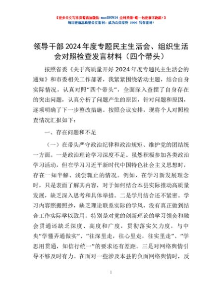 / 领导干部2024年度专题民主生活会、组织生活会对照检查发言材料(四个带头)