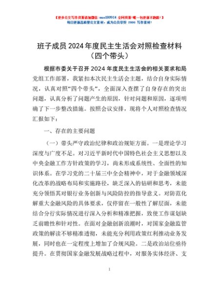 / 班子成员2024年度民主生活会对照检查材料(四个带头)