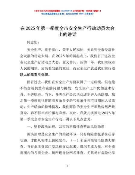 / 在2025年第一季度全市安全生产行动动员大会上的讲话