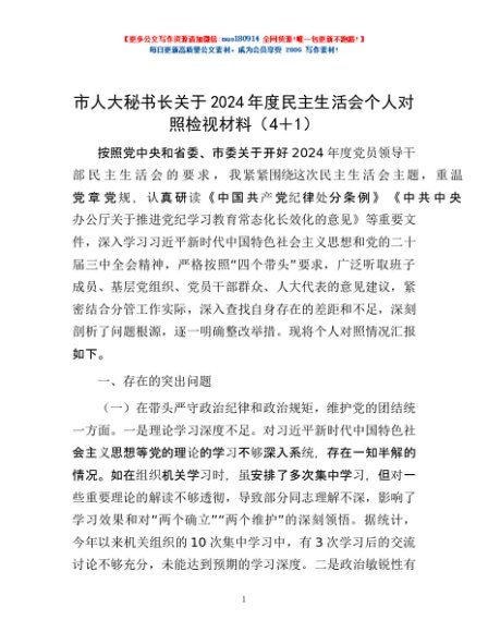 / 市人大秘书长关于2024年度民主生活会个人对照检视材料(4+1)