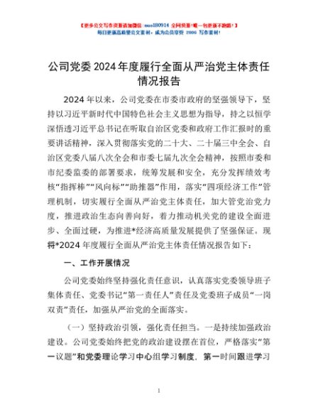 / 公司党委2024年度履行全面从严治党主体责任情况报告