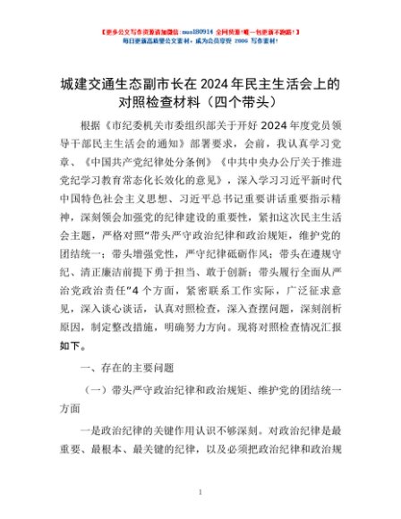 / 城建交通生态副市长在2024年民主生活会上的对照检查材料(四个带头)