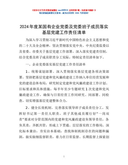 / 2024年度某国有企业党委及党委班子成员落实基层党建工作责任清单