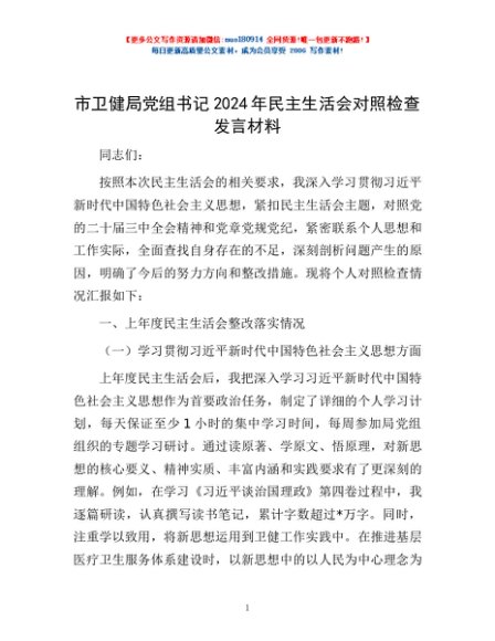 / 市卫健局党组书记2024年民主生活会对照检查发言材料
