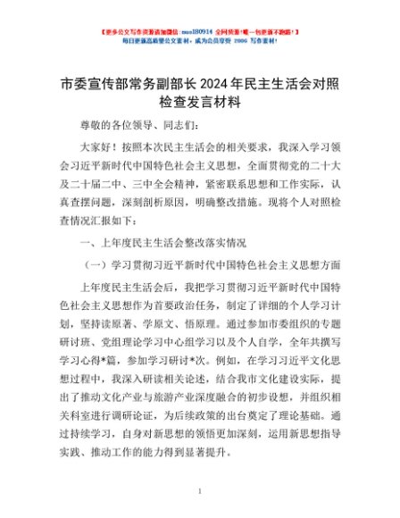 / 市委宣传部常务副部长2024年民主生活会对照检查发言材料