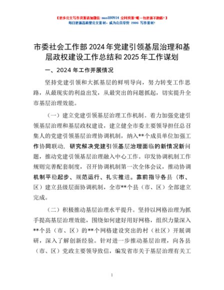 / 市委社会工作部2024年党建引领基层治理和基层政权建设工作总结和2025年工作谋划