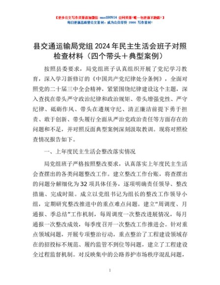 / 县交通运输局党组2024年民主生活会班子对照检查材料(四个带头+典型案例)