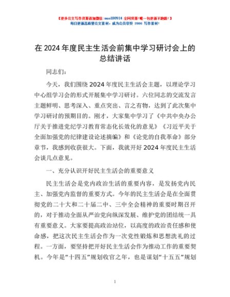 / 在2024年度民主生活会前集中学习研讨会上的总结讲话