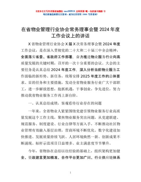 / 在省物业管理行业协会常务理事会暨2024年度工作会议上的讲话