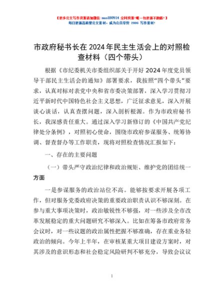 / 市政府秘书长在2024年民主生活会上的对照检查材料(四个带头)