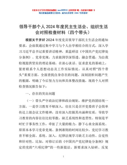 / 领导干部个人2024年度民主生活会、组织生活会对照检查材料(四个带头)