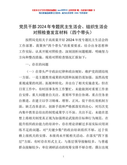 / 党员干部2024年专题民主生活会、组织生活会对照检查发言材料(四个带头)