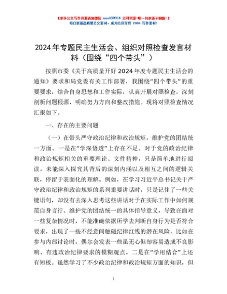 / 2024年专题民主生活会、组织对照检查发言材料(围绕“四个带头”)