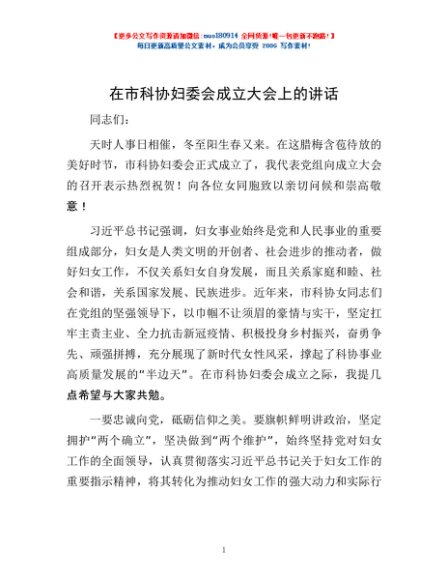 / 在市科协妇委会成立大会上的讲话
