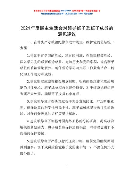 / 2024年度民主生活会对领导班子及班子成员的意见建议