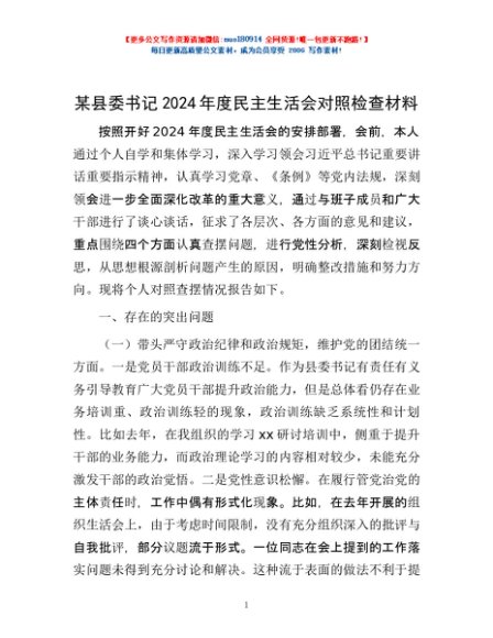 / 某县委书记2024年度民主生活会对照检查材料