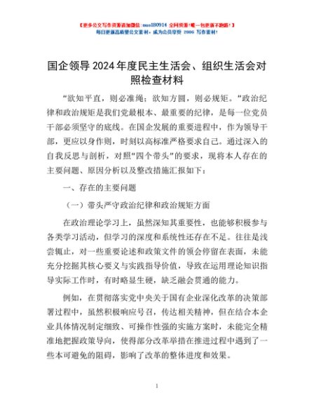/ 国企领导 2024 年度民主生活会、组织生活会对照检查材料