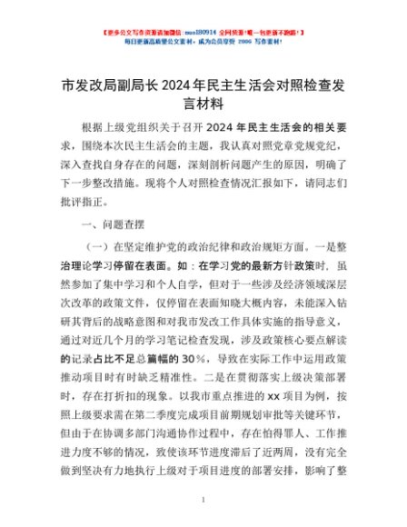 / 市发改局副局长2024年民主生活会对照检查发言材料