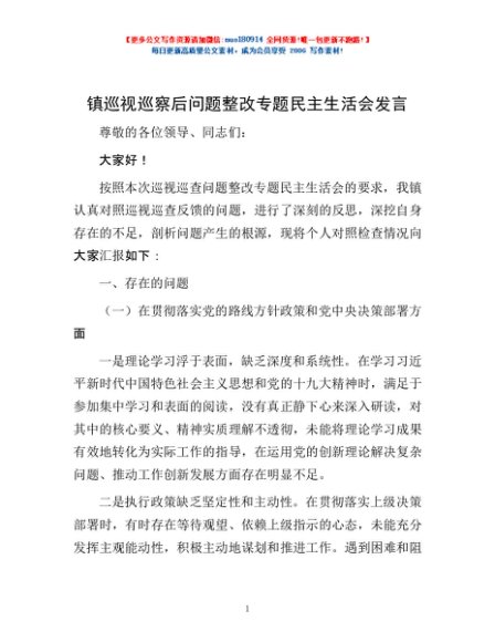 / 镇巡视巡察后问题整改专题民主生活会发言