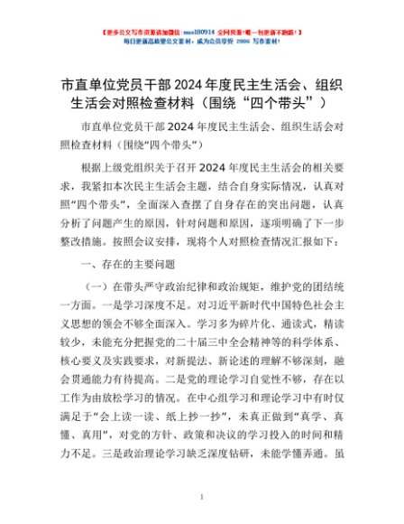 / 市直单位党员干部2024年度民主生活会、组织生活会对照检查材料(围绕“四个带头”)