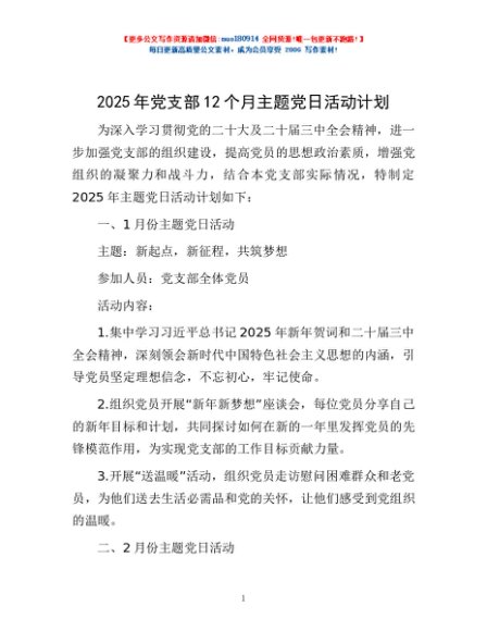 / 2025年党支部12个月主题党日活动计划