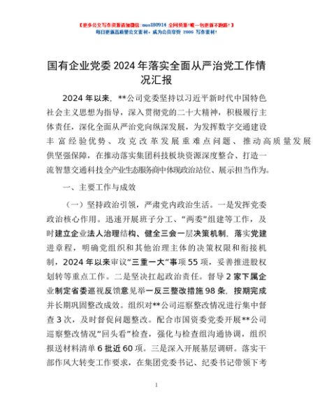 / 国有企业党委2024年落实全面从严治党工作情况汇报
